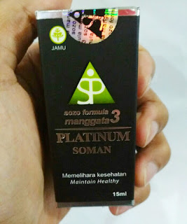 Jamu herbal Tetes sozo Soman formula manggata 3 Platinum SFM3 Telah lulus uji LIPI dan Laboratorium Farmasi UI 100% di jamin Halal Sertifikasi MUI Nomor Registrasi BPOM TR 083 677 671, dengan komposisi yang unik, setiap tetesnya mengandung unsur yang dibutuhkan dalam perlindungan tubuh, seperti enzim, asam amino, omega3, omega6, antioksidan, vitamin A,B,C,D,E dan vitamin K, mineral serta probiotik alami.